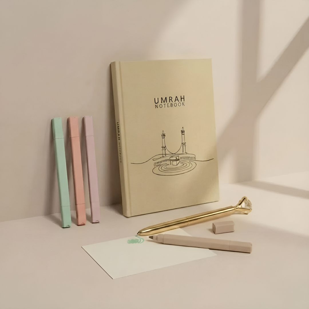 De Umrah Set is ontworpen voor pelgrims die hun reis bewust willen ervaren. Met een premium notebook, elegante pen en marker heb je alles bij de hand om je gedachten, dua’s en reflecties op een mooie en georganiseerde manier vast te leggen.